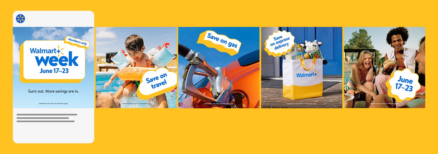 The sun is out and so are the savings. 2024’s Walmart+ Week was kicking off the summer. Given only the logo lockup, I sourced stock photography and footage of outdoor textures: pool water, beach sand, & blue sky. And paired with with stock photo and footage of people enjoying the sun.