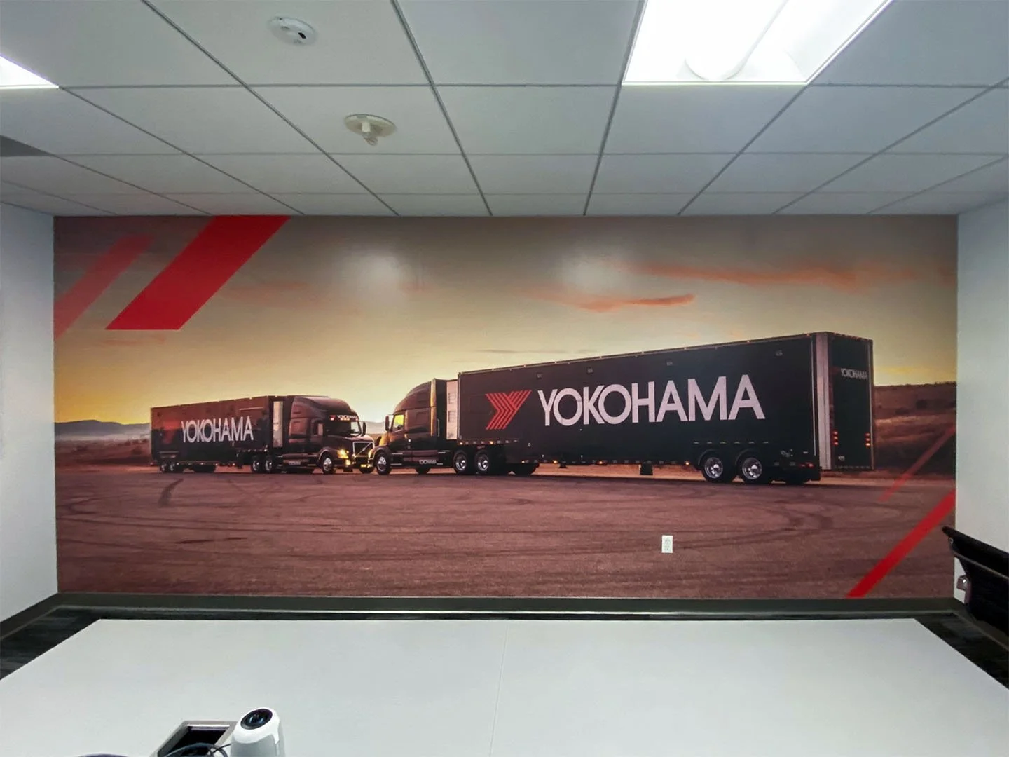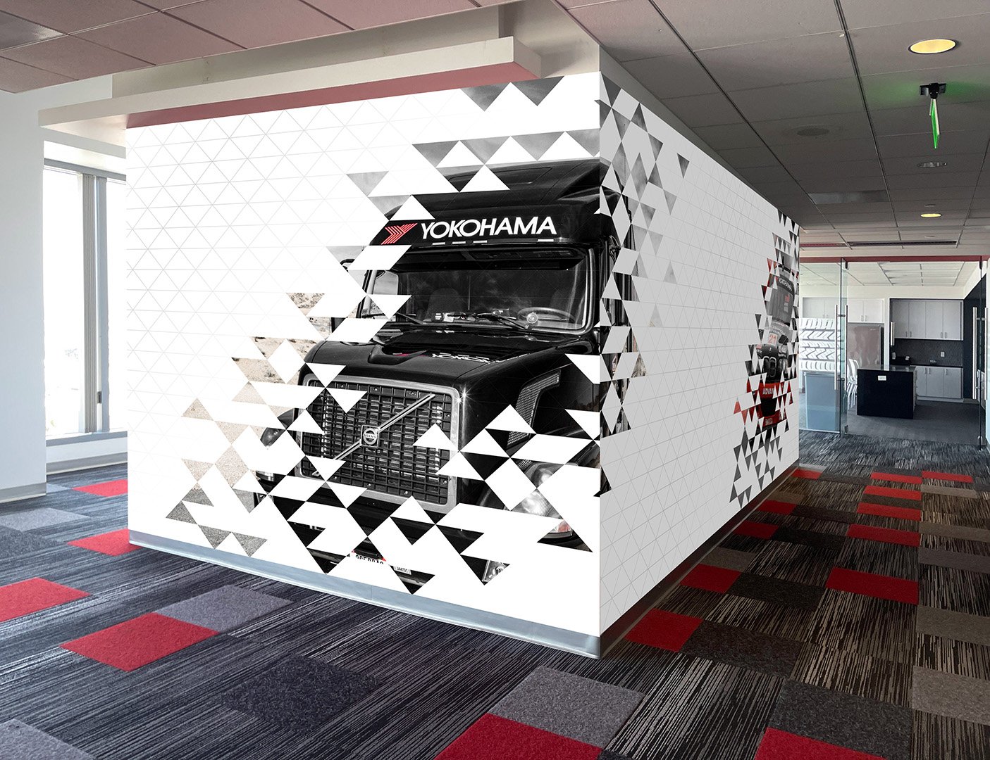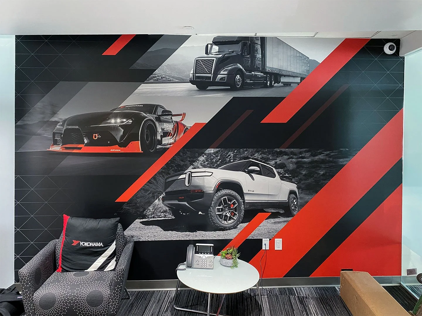 Provided with a couple of Yokohama brand logos and a library of vehicle photography, I was tasked to design office graphics that would express the spirit of the company to any visitor that walks in.